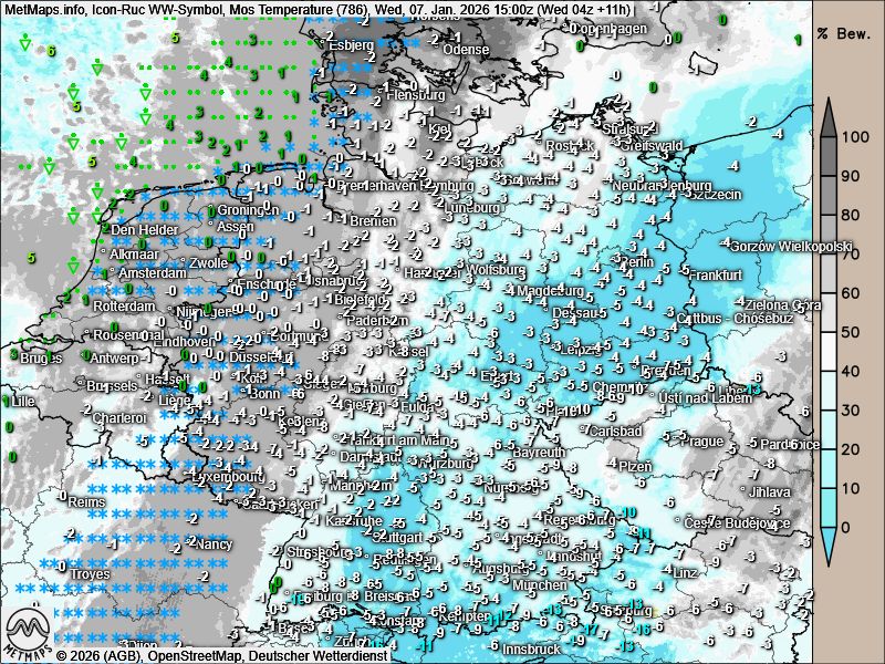 In der Nacht sowie am Donnerstag steigen die Temperaturen im Westen verbreitet in den Plusbereich, es setzt Tauwetter ein.