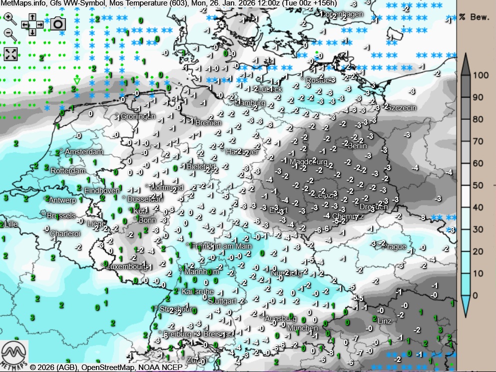 Besonders im Norden und Nordosten ist dann verbreitet mit Dauerfrost zu rechnen. Deutlich milder präsentiert sich im Vergleich die Westhälfte des Landes, wo die Temperaturen überwiegend im einstelligen Plusbereich bleiben.
