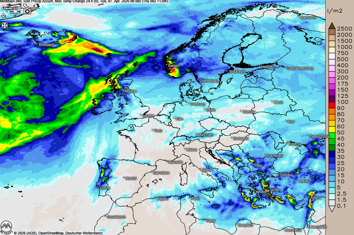 Ein Blick auf die akkumulierten Niederschläge bis Dienstagfrüh (ICON) zeigt: In Deutschland fällt über Ostern vor allem in der Nordhälfte zeitweise etwas Regen, insgesamt bleiben die Mengen jedoch überschaubar. Noch trockener ist es in großen Teilen Frankreichs und Norditaliens, wo vielerorts kaum nennenswerter Niederschlag zu erwarten ist.