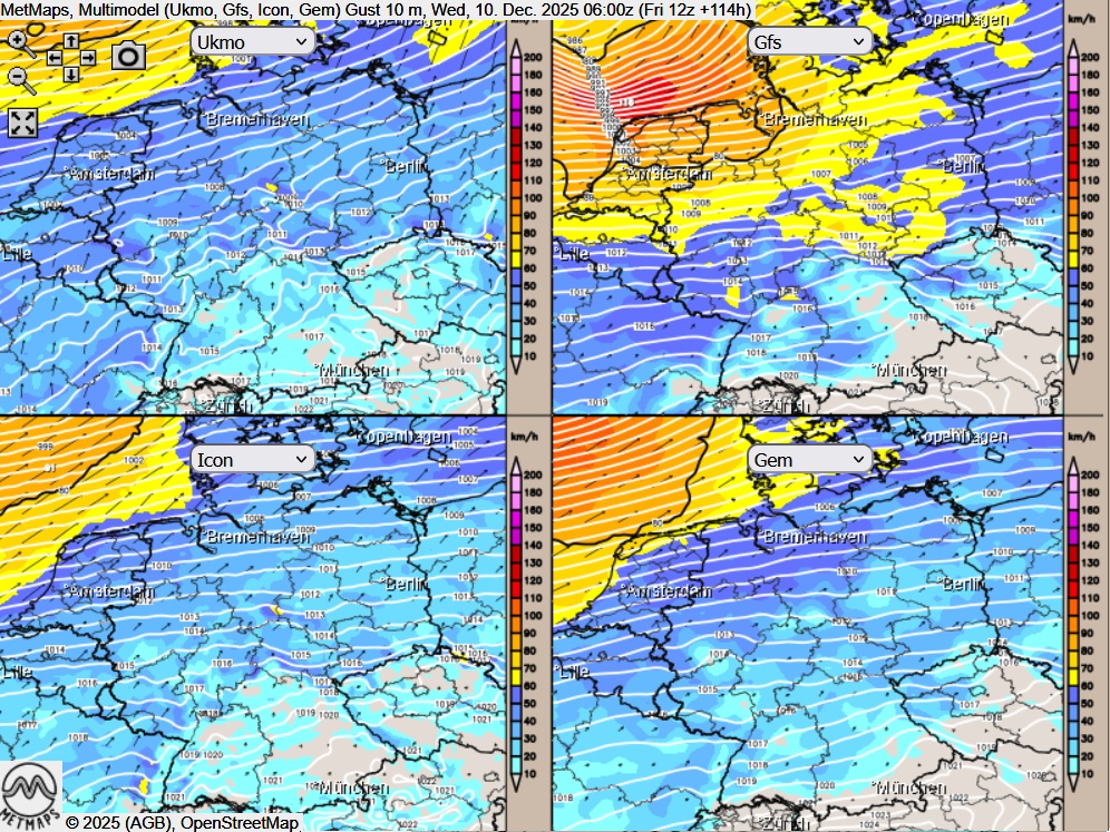Vor allem den nördlichen Teilen Deutschlands könnten in der neuen Woche unruhige Zeiten bevorstehen: Für den Mittwoch rechnen viele Wettermodelle zur Zeit mit einer schweren Sturmlage, das US-Modell GFS weist für die frühen Morgenstunden des 10. Dezember sogar orkanartige Böen (Windstärke 11) um 116 km/h aus. Ab einer Windgeschwindigkeit von 117 km/h ist die volle Orkanstärke / Windstärke 12 erreicht.