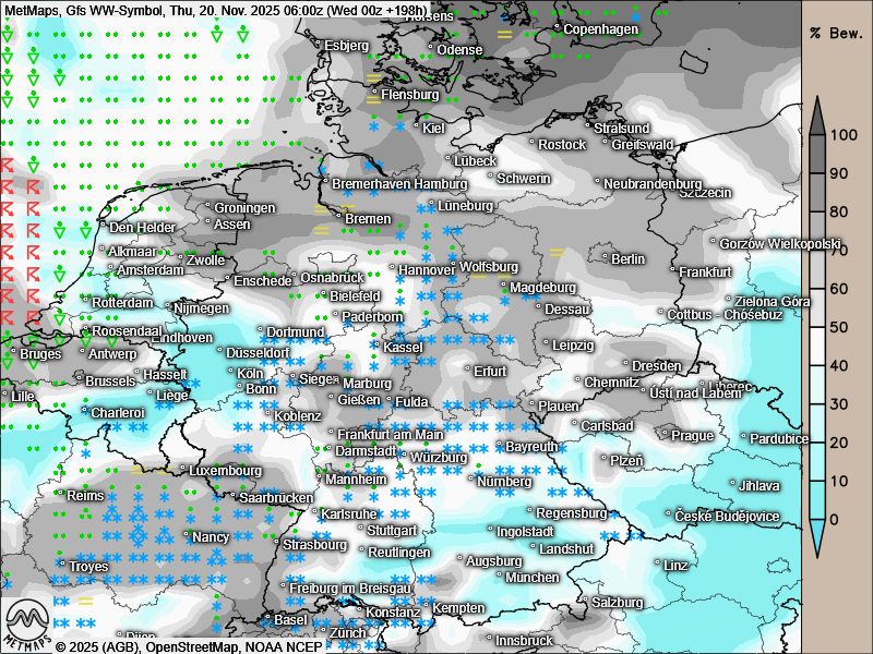Die Wetterkarte für Donnerstagfrüh (20.11.2025, 06:00 Uhr) sowie die Schneehohen Freitagfrüh (21.11.2025, 06:00 Uhr) nach GFS: