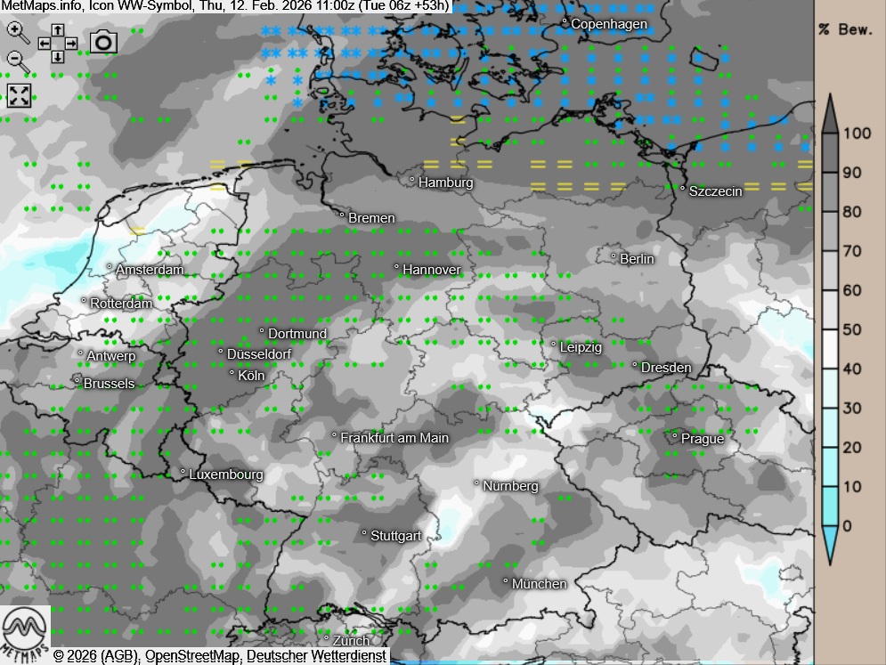 Die Prognosekarten für Weiberfastnacht (11:00 Uhr) nach ICON: