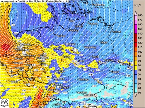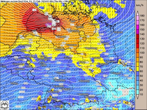 Am Abend und in der Nacht auf Freitag zieht der Sturm dann nach Norden weiter - von Sturm betroffen ist dann vor allem das nördliche NRW, Niedersachsen und Schleswig-Holstein sowie Bremen und Hamburg.