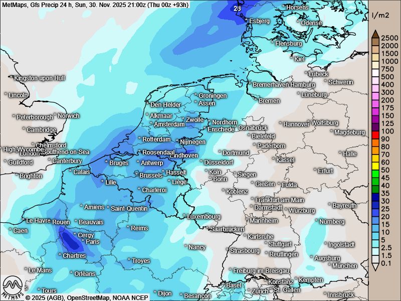 Die GFS-Wetterkarte für Sonntagmorgen sowie die 24-Stunden-Regenmengen bis Sonntagabend - teilweise fallen binnen 24 Stunden bis zu 30 l/m² Regen.