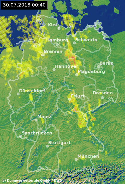 Das Radarbild zeigt aktuell zwar einige Signale, etwas Regen fällt jedoch nur aus den rötlicheren Bereichen der Signale die Richtung Nordosten wandern. Sonst präsentiert sich der Himmel über Deutschland teils bewölkt, teils sternenklar.