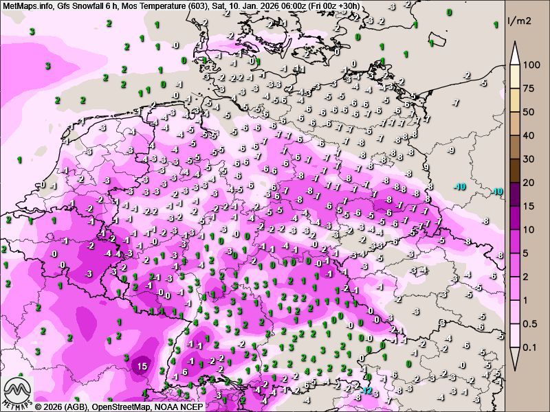 Die Böenkarte für Freitagmittag, die Sechs-Stunden-Schneemengen bis Freitagmittag sowie die Sechs-Stunden-Schneemengen bis Samstagfrüh nach GFS: