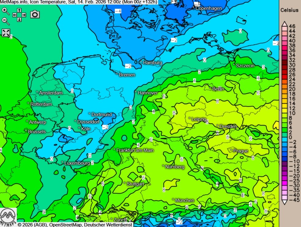 Die ICON-Wetterkarten für Valentinstag (12:00 Uhr) nach ICON: