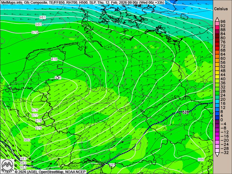 Die Strömungskarte für Donnerstagfrüh (09:00 Uhr) nach GFS, die Wetterkarten für Donnerstag (09:00, 12:00 Uhr) sowie die Wind- und Temperaturkarte für Donnerstagnachmittag (15:00 Uhr) nach ICON: