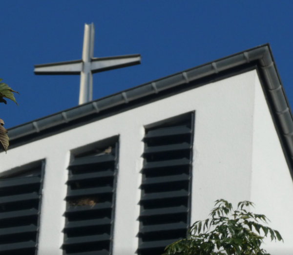 Man muss schon genau hinschauen, wer sich da im Fenster des Gotteshauses niedergelassen hat. Ein zweiter Blick verrät: Es ist eine Mehlschwalbe, passenderweise auch Kirchschwalbe genannt, samt Nest.