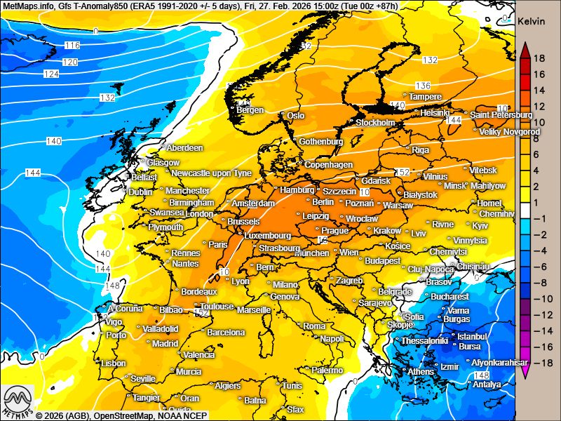 10 bis 12 Grad zu warme Luft über Mitteleuropa.