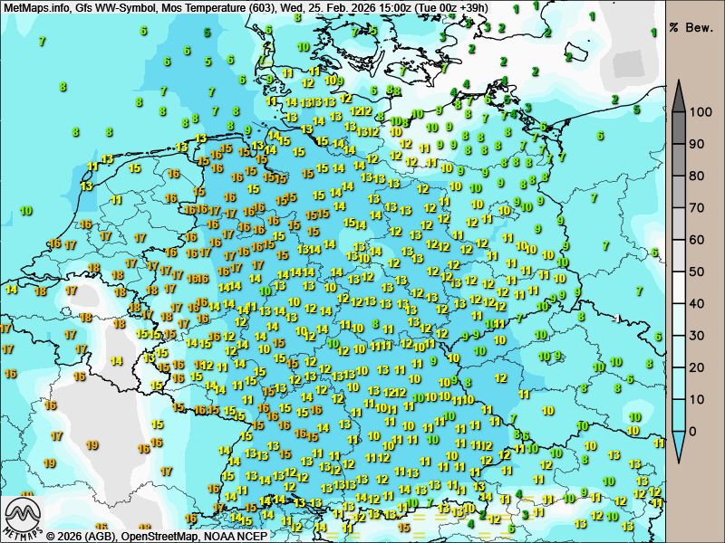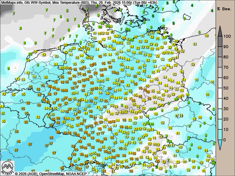 Mitteleuropa steht vor einer weiteren markanten Erwärmung; die Temperaturen steigen in den kommenden Tagen deutlich an: In den Nachmittagsstunden werden vielerorts Höchstwerte von bis zu knapp 20 Grad Celsius erreicht.