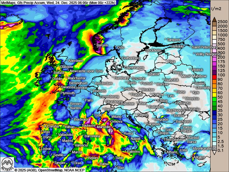 Die akkumulierten Regenmengen bis Heiligabend sowie die Strömungskarte  Mitteleuropa / Wetterkarte Deutschland für Heiligabend nach GFS: