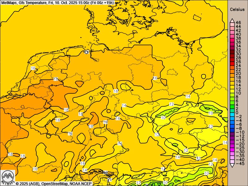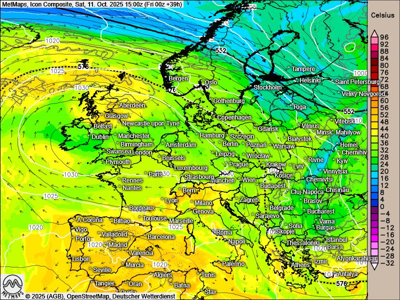 Die Strömungskarte Europa für Samstagnachmittag (15:00 Uhr) nach Icon sowie die Lufttemperaturen und Wetterkarte am Freitagnachmittag (15:00 Uhr) nach GFS: