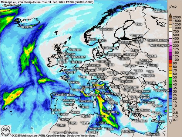 Niederschlagssummen Europa bis Dienstag, 11.02.2025 nach ICON