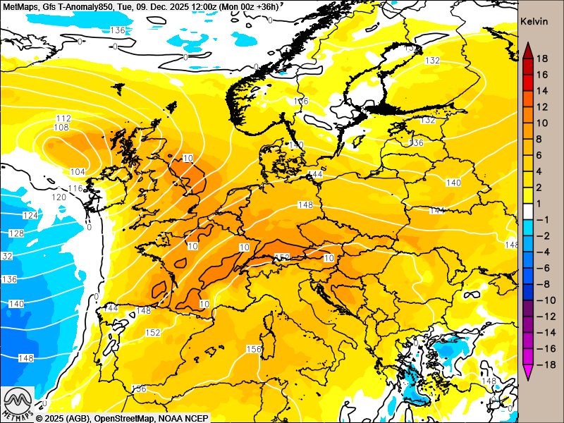 Temperaturanomalie Europa 850 hPa am Dienstagmittag