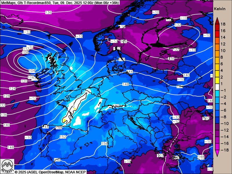 Abweichung Rekordtemperatur Europa 850 hPa am Dienstagmittag