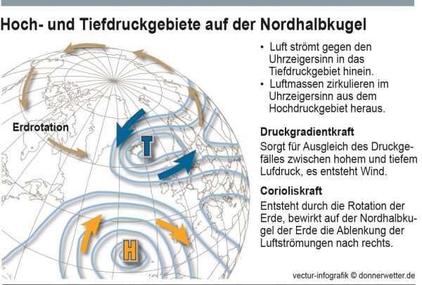 Ist der Luftdruck in einem Gebiet höher als der im Mittel an der Erdoberfläche beobachtete Druck von 1013 hpa, so wird dieses Gebiet als ein Hoch gekennzeichnet. Hier fließt die Luft im Uhrzeigersinn um dieses Hoch. Im Hoch sinkt die Luft ab und sorgt so für wenige Wolken und wenig Regen.