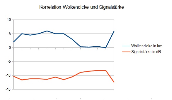Flüssigwassergehalt der Atmosphäre bestimmt werden, und dadurch auch näherungsweise die Wolkendicke und die Wolkenart. Vor allem zwischen Wolkendicke und Signalstärke besteht eine sehr hohe negative Korrelation. Besonders eng ist der