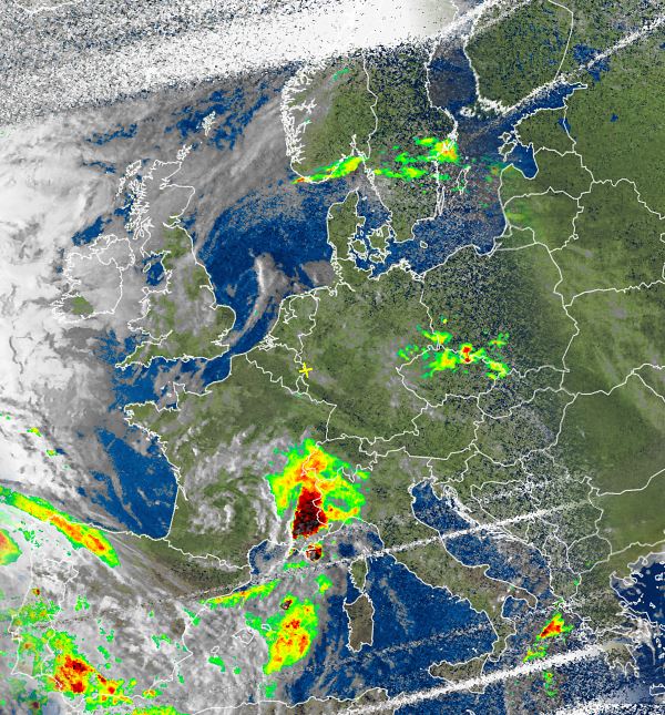 Auf dem Satellitenfoto von Samstag Nachmittag ist über dem Süden Frankreichs und an der Grenze zu Italien eine ausgeprägte Schauer- und Gewitterzelle zu sehen. Hier kam es am Nachmittag und Abend vielerorts zu teils schweren Unwettern mit teils sintflutartigen Regengüssen, Hagel und sogar Sturmböen.