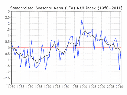 Die Grafik zeigt die Stärke des NAO-Index seit 1950. Deutlich zu erkennen ist, dass die Werte in den 1980er und 1990er Jahren teilweise stark positiv waren, seit den 2000er Jahren eher um die 0-Marke pendelten und teilweise deutlich im Minus waren. Das heißt die Westwinde waren in der 1980er und 1990er Jahren stark, in vergangenen 10 Jahren nahmen sie ab. Die 80er und 90er Jahren von vielen milden Wintern geprägt, während die vergangenen vier Winter durchschnittlich oder kälter ausfielen.